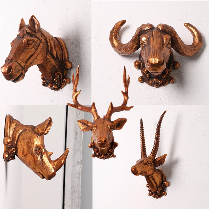 ORIGINAL Copper Style Woodcut Creative Resin Animal Head Rhino Bull Horse Deer Antelope Head Wall Decoration